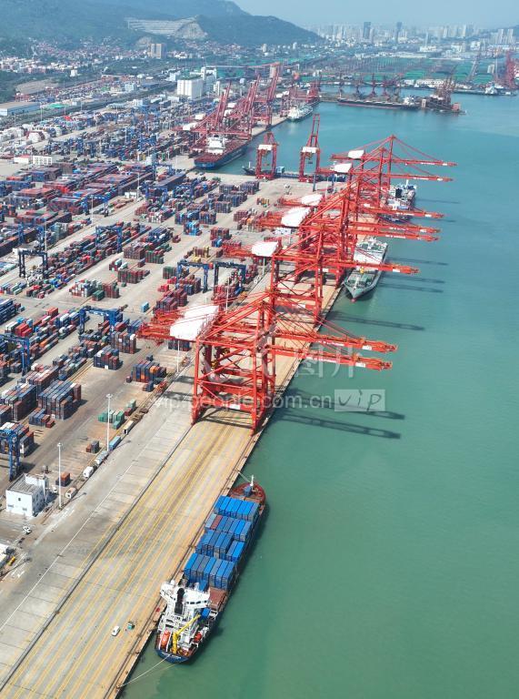 2023年6月7日,轮船在江苏连云港港外贸集装箱码头装卸集装箱。