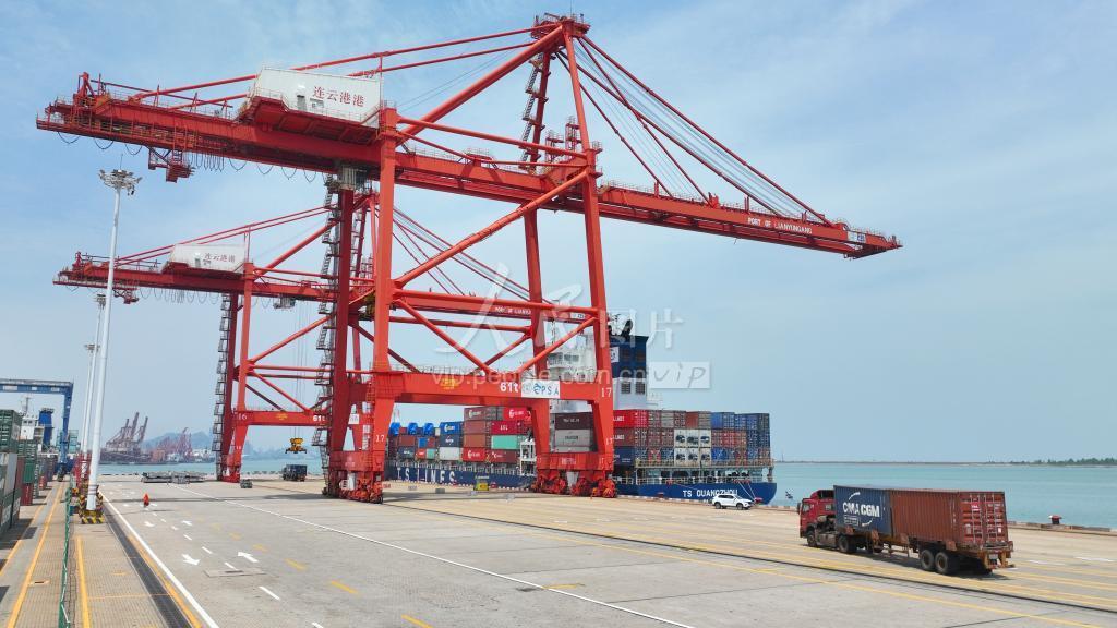 2023年6月7日,轮船在江苏连云港港外贸集装箱码头装卸集装箱(。