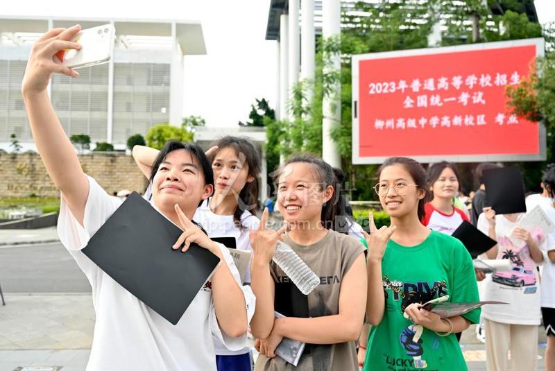 上传时间: 2023-06-08 19:03:49 图片说明: 6月8日,在广西柳州高中考点,考生在考场外留影。