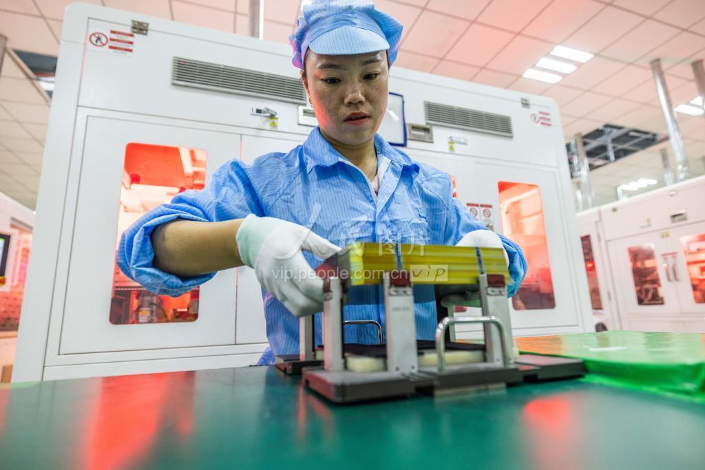 2023年6月11日,工人在贵州省毕节市威宁自治县新能源产业园贵州一道长通新能源有限公司光伏板组件生产线上作业。