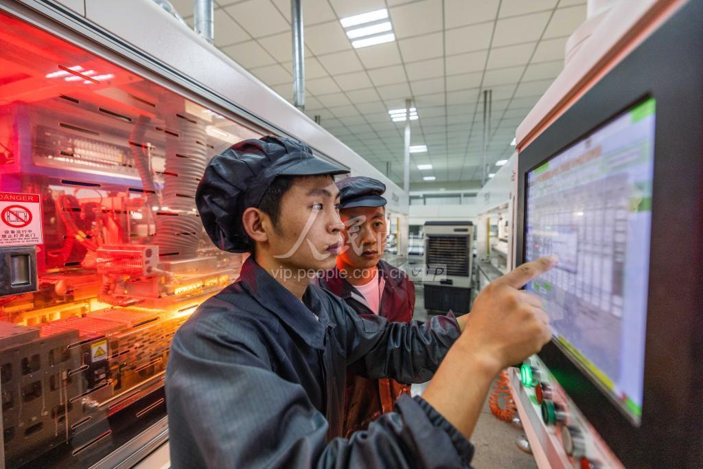 2023年6月11日,工人在贵州省毕节市威宁自治县新能源产业园贵州一道长通新能源有限公司光伏板组件生产线上作业。