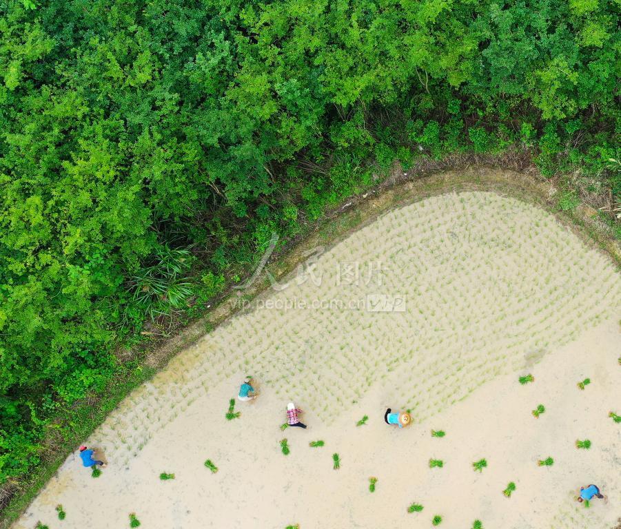 2023年6月16日,湖南省永州市新田县骥村镇陆家村,村民在栽插中稻,田间一片忙碌景象。