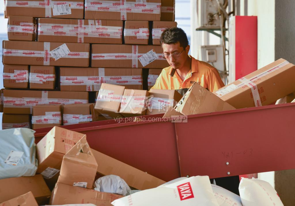 2023年6月20日,江苏省宿迁市沭阳县电商物流产业园韵达快递公司分拣中心,工作人员在忙着对“618”网购节期间消费者购买的大量快递包裹进行装卸、分拣、运送,现场一片繁忙景象。