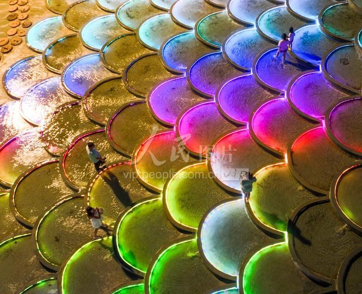 夏日的夜晚,河北省遵化市山里各庄夕阳谷景区的鱼鳞坝五颜六色,瑰丽夺目。游人纷至沓来,戏水赏景,游玩拍照,乐享夜色美景。