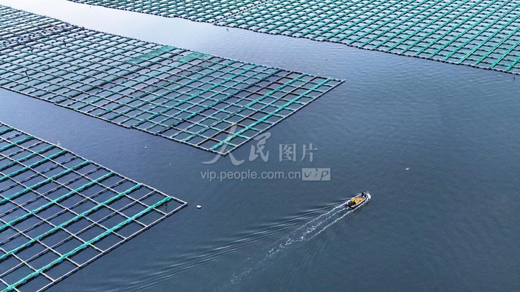 2023年6月30日,在山东省荣成市桑沟湾海洋牧场筏式养殖区,渔民们驾驶养殖船运送海参参苗到海参养殖区投放。