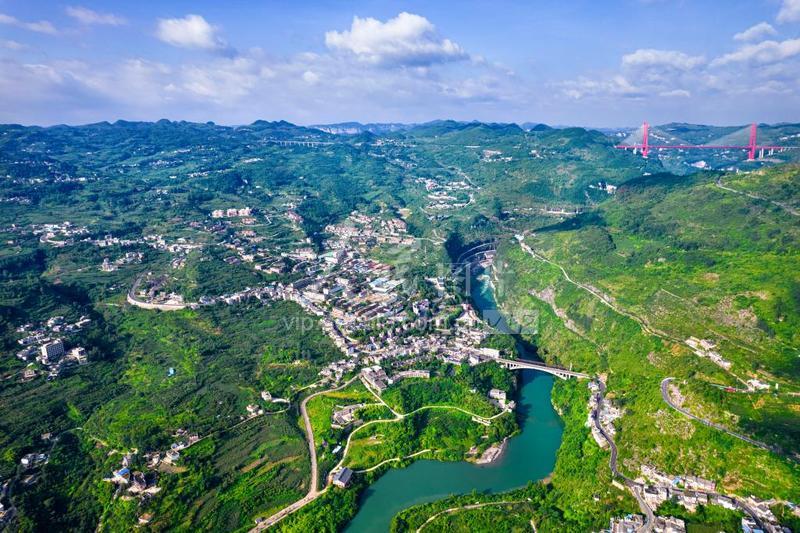 盛夏时节,贵州省清镇市新店镇鸭池河村,村庄、河流、公路、桥梁、大山构成一幅壮美的乡村图景。 近年来,地处乌江干流鸭池河右岸的鸭池河村坚持绿水青山就是金山银山的理念,依托峡谷气候和交通、地理等优势,因地制宜调整农业结构种植李子、枇杷、樱桃等经果林产业。同时利用当地鸭池河风光以及红军强度鸭池河天险渡口等红色文化,加强公共旅游基础设施建设和红色文化遗迹保护性建设,农文旅融合打造红色美丽乡村,助力乡村全面振兴。