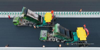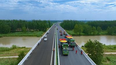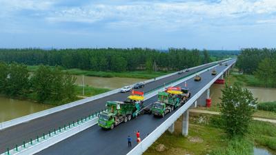 2023年7月6日,江苏省宿迁市沭阳县境内宿连高速公路工程,建设人员冒着酷暑在进行摊铺沥青作业,全力推进项目建设进度。