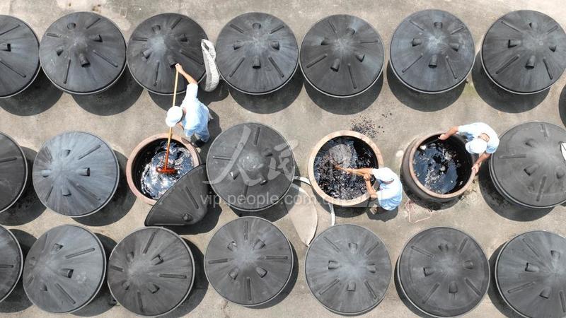 2023年7月18日,位于浙江省湖州市德清县禹越镇的五味和食品有限公司酿醋生产基地,工人忙着进行入料、翻醅、装缸、封缸等制醋工序,利用高温生产香醋。这种传统酿醋技艺以当地优质大米、糯米、纯中药制作醋曲,经过蒸煮、酿晒、发酵等30余道工序制作而成,食醋产品畅销海内外市场,订单迎来产销两旺的良好势头。