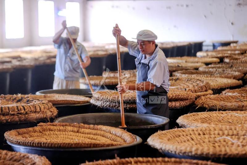 2023年7月18日,位于浙江省湖州市德清县禹越镇的五味和食品有限公司酿醋生产基地,工人忙着进行入料、翻醅、装缸、封缸等制醋工序,利用高温生产香醋。这种传统酿醋技艺以当地优质大米、糯米、纯中药制作醋曲,经过蒸煮、酿晒、发酵等30余道工序制作而成,食醋产品畅销海内外市场,订单迎来产销两旺的良好势头。
