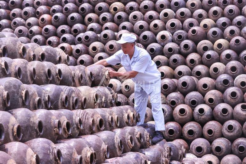 2023年7月18日,位于浙江省湖州市德清县禹越镇的五味和食品有限公司酿醋生产基地,工人在堆放醋缸。