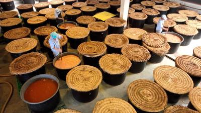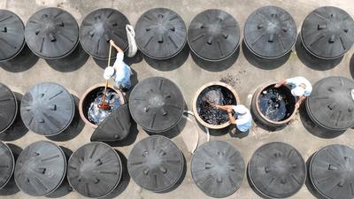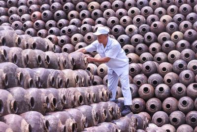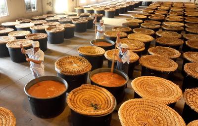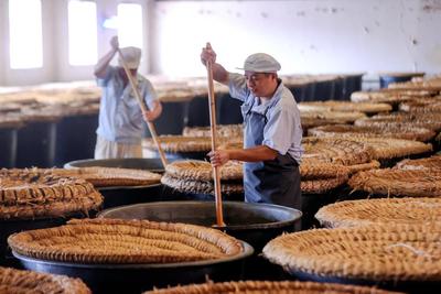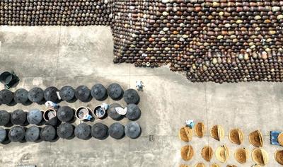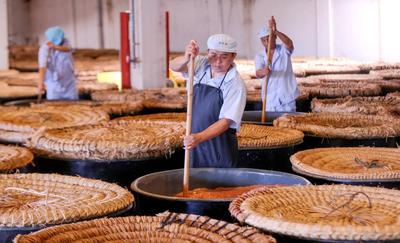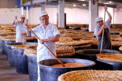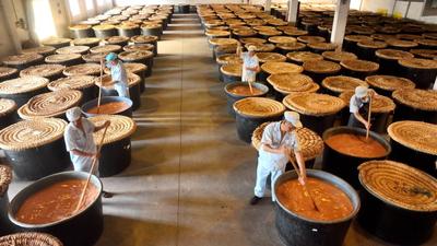 2023年7月18日,位于浙江省湖州市德清县禹越镇的五味和食品有限公司酿醋生产基地,工人忙着进行入料、翻醅、装缸、封缸等制醋工序,利用高温生产香醋。这种传统酿醋技艺以当地优质大米、糯米、纯中药制作醋曲,经过蒸煮、酿晒、发酵等30余道工序制作而成,食醋产品畅销海内外市场,订单迎来产销两旺的良好势头。