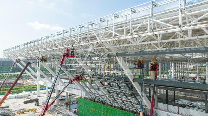 2023年7月23日,在安徽省合肥西站施工现场,工人正在进行高空焊接作业。