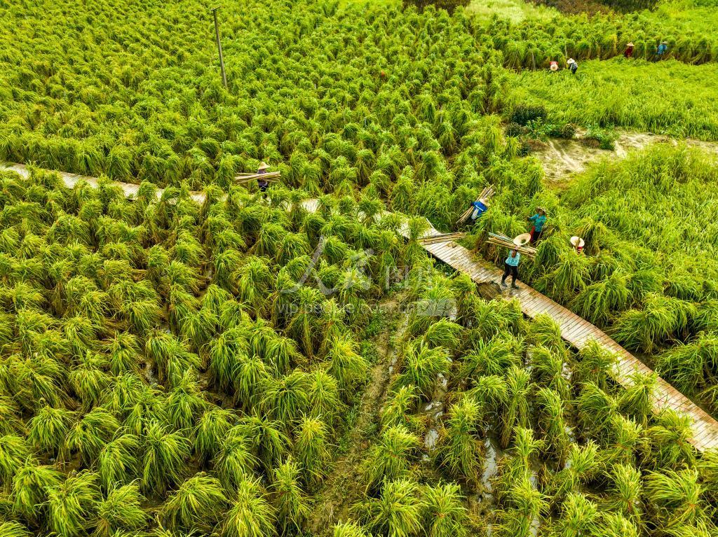 2023年7月23日,广西梧州市长洲区倒水镇富万村农民抢抓农时进行田间管护巨型水稻,乡村田野一片繁忙景象。 眼下,正值“双抢”农忙时节,广西梧州市县各地农民不误农时,抓住晴好天气,抢收早稻、抢插晚稻,奋力夺取早晚稻双丰收。
