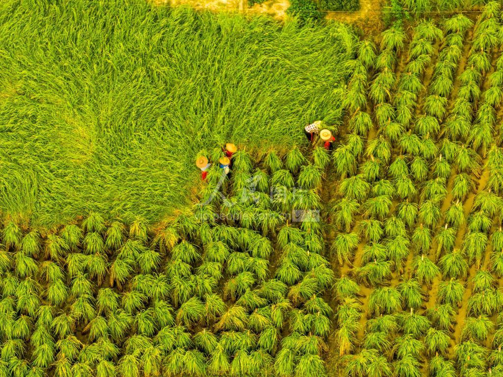 2023年7月23日,广西梧州市长洲区倒水镇富万村农民抢抓农时进行田间管护巨型水稻,乡村田野一片繁忙景象。 眼下,正值“双抢”农忙时节,广西梧州市县各地农民不误农时,抓住晴好天气,抢收早稻、抢插晚稻,奋力夺取早晚稻双丰收。