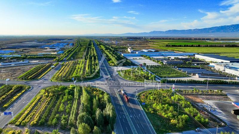 2023年7月21日,在甘肃省张掖市民乐县交通大林带工业园区段,道路两边的乔灌混交林已初具规模。