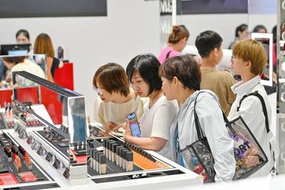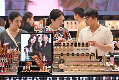 2023年8月9日,cdf海口国际免税城内游客正在香化区选购免税品。