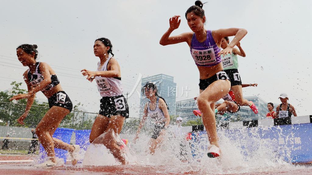2023年8月11日,第21届全国大学生田径锦标赛3000米障碍赛现场,参赛选手快速跨越水池。