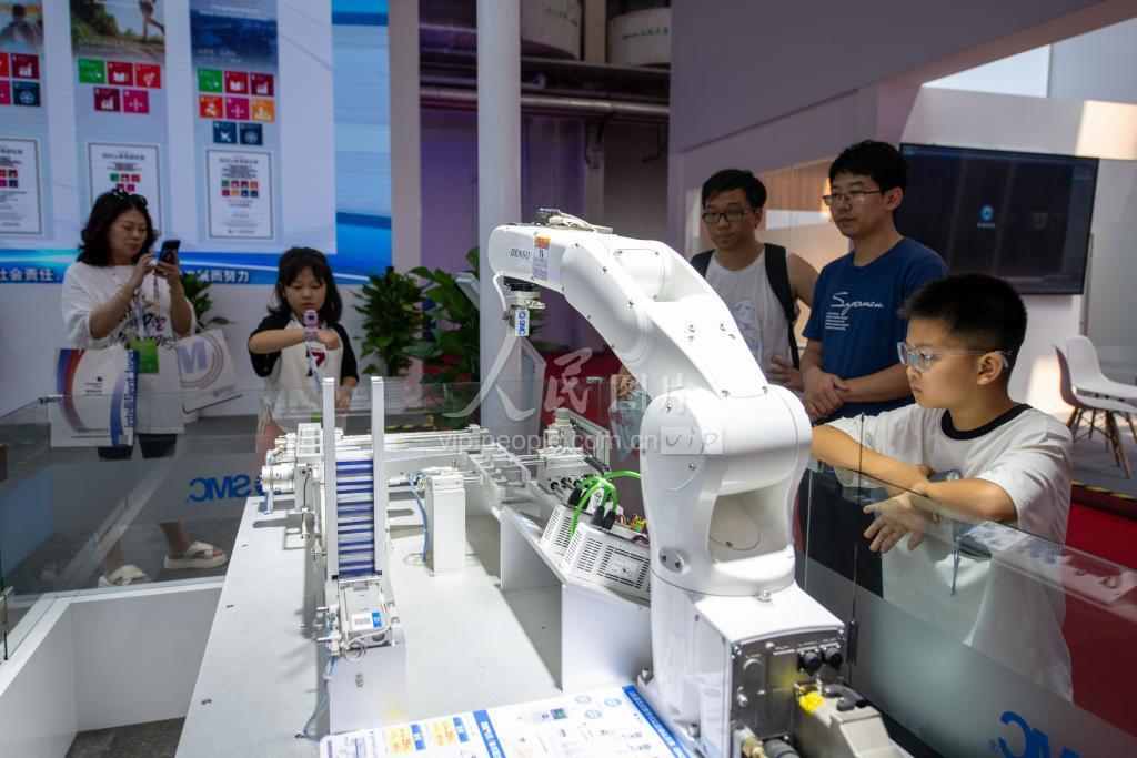 8月16日,在2023世界机器人大会现场,参观者对工业机器人非常感兴趣。