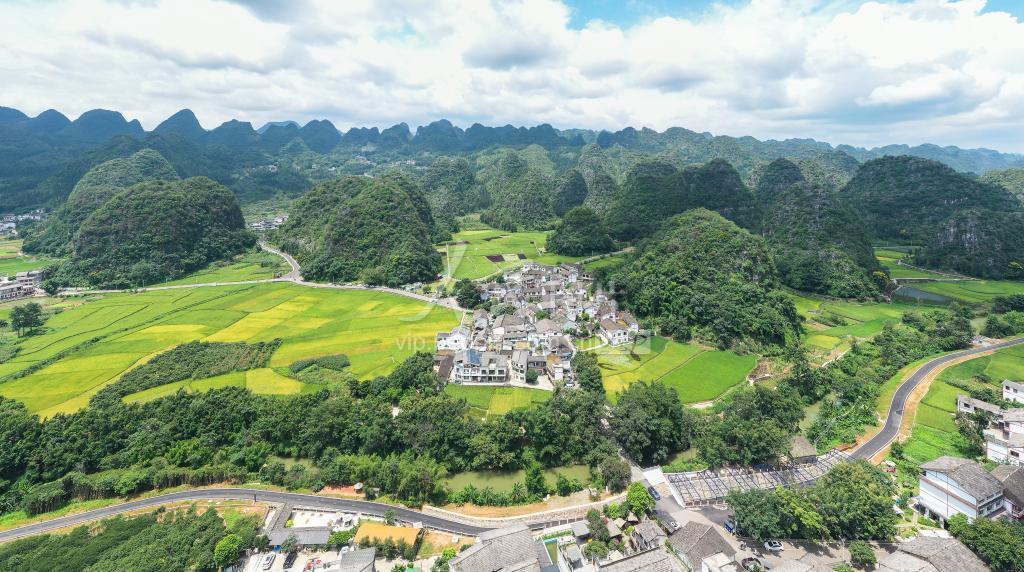 初秋时节,贵州省黔西南布依族苗族自治州兴义市万峰林景区田野色彩缤纷,秀峰、村舍与田间水稻相映成趣,景美如画,吸引人们前来游览观赏。