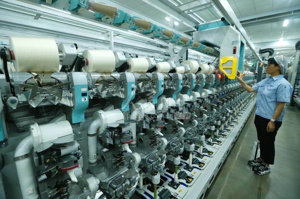 2023年8月22日,在位于山东省青岛市即墨区即发龙山工业园的青岛即发盛宝纺织有限公司,工人在数字化纺纱智能生产线上生产高端纤维。