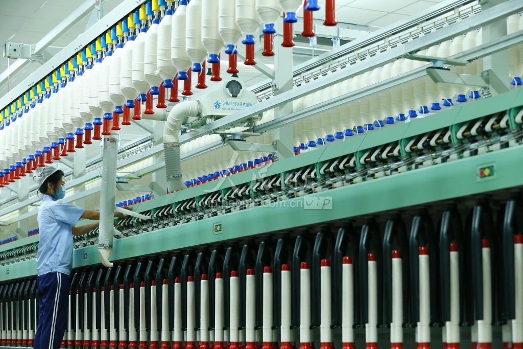 2023年8月22日,在位于山东省青岛市即墨区即发龙山工业园的青岛即发盛宝纺织有限公司,工人在数字化纺纱智能生产线上生产高端纤维。