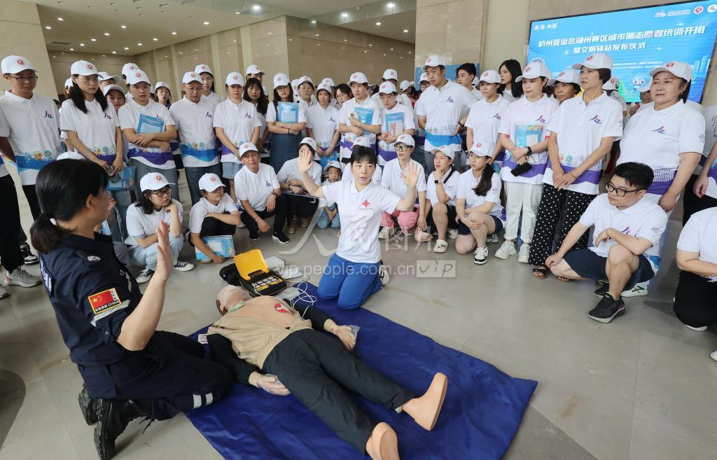 2023年8月23日,在浙江工业大学莫干山校区,培训讲师为杭州亚运会湖州赛区城市侧志愿者指导心肺复苏技能。