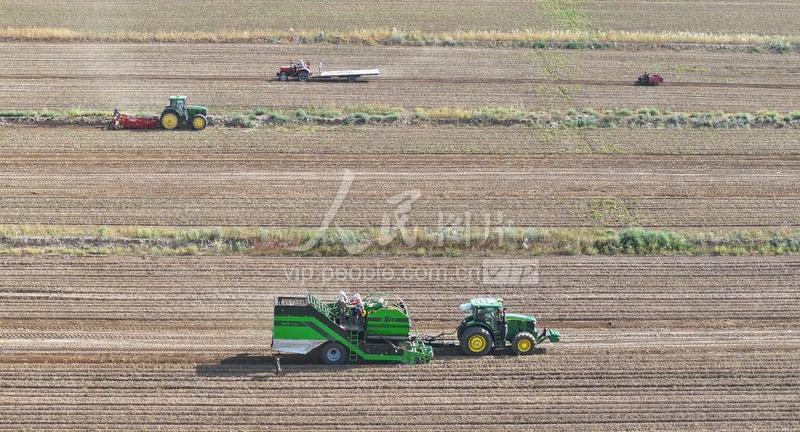 2023年8月30日,在甘肃省张掖市民乐县南古镇东朱千亩马铃薯种植基地,多台马铃薯收获机正在进行收获作业。