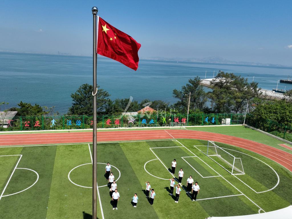 2023年8月31日,在山东省青岛西海岸新区灵山岛学校,学生和老师在开学典礼上升国旗。