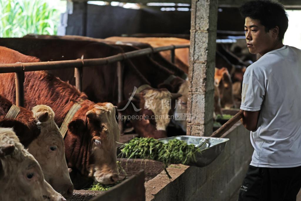 2023年9月5日,在重庆市彭水苗族土家族自治县三义乡龙合村,失去双手的残疾青年宿祖兵忙碌着喂养肉牛。 2008年,在外务工的宿祖兵因一次意外事故,导致双手前臂截断,突如其来的灾难,让原本贫困的家庭更是雪上加霜。宿祖兵一度意志消沉,对生活失去了希望。后来,在当地党委、政府的帮扶下,宿祖兵重新找回生活的希望。2015年,他开始探索肉牛养殖。 在没有双手的情况下,宿祖兵在建牛棚、割牛草、拌饲料、喂牛等方面,努力克服自身困难,用双臂夹着工具劳动,建设了标准化的肉牛养殖场,配套完善了粪便、污水处理设施,肉牛养殖规模也不断壮大,从最初的6头黄牛,到如今的80多头存栏规模。