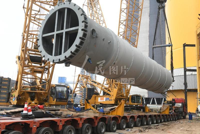 2023年9月10日,在安徽省阜阳市颍东化工园区安徽昊源化工厂40万吨尿素装置项目工地,大型吊车在吊装40万吨尿素装置项目上的尿素合成塔。