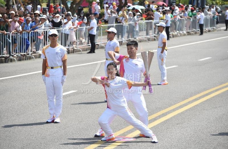 9月13日,浙江省舟山市,第128棒火炬手、普陀山首名高级导游员谢丽(前)与第129棒火炬手、浙江荣顺科技有限公司的潘荣望(后)在点位交接。