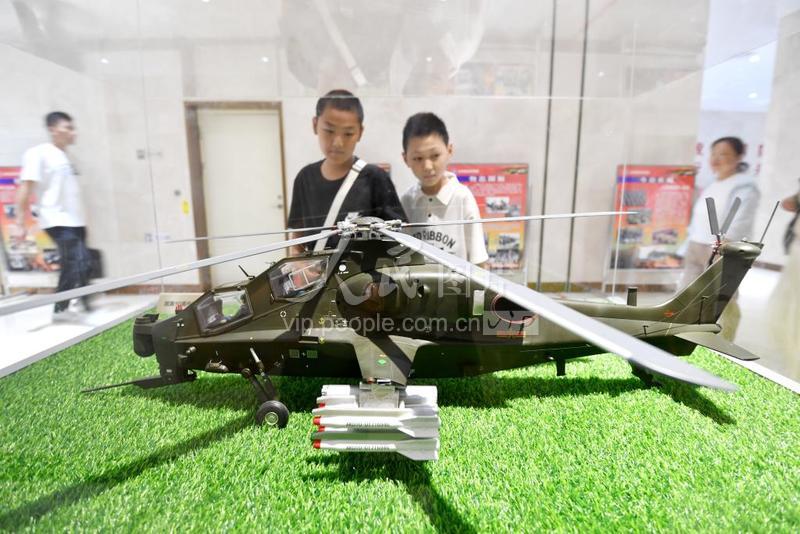 2023年9月16日,河北省石家庄市的小学生在石家庄解放纪念馆全民国防教育展室参观战斗机模型。