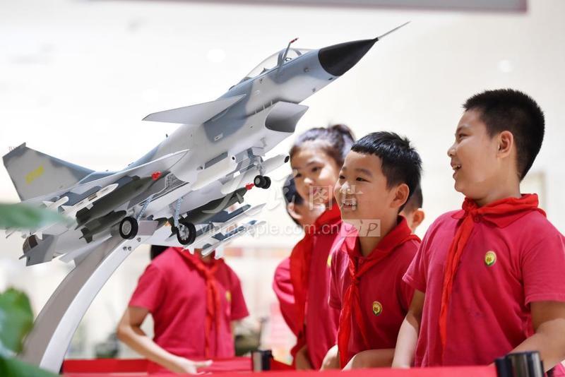 2023年9月16日,河北省石家庄市的小学生在石家庄解放纪念馆全民国防教育展室参观战斗机模型。