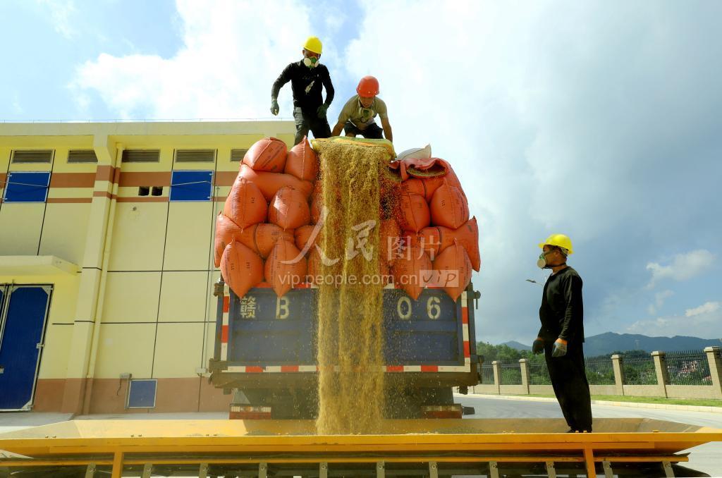 2023年9月19日,在江西省赣州市大余县粮食储备中心,工作人员正在将验收合格的稻谷输送入库。