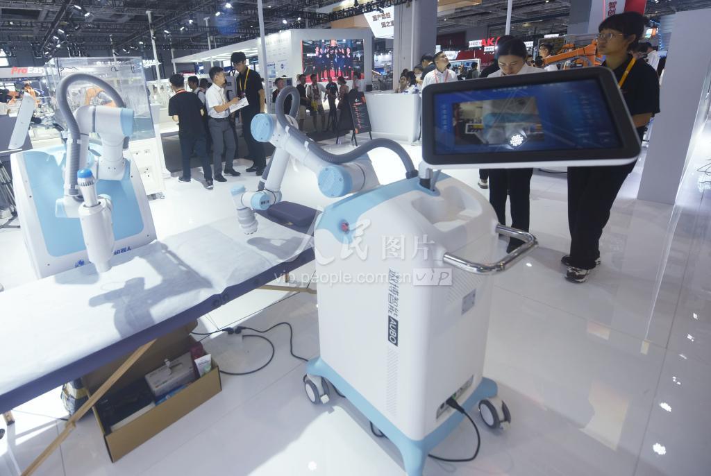 2023年9月19日,参观者在观看理疗机器人进行理疗按摩演示。