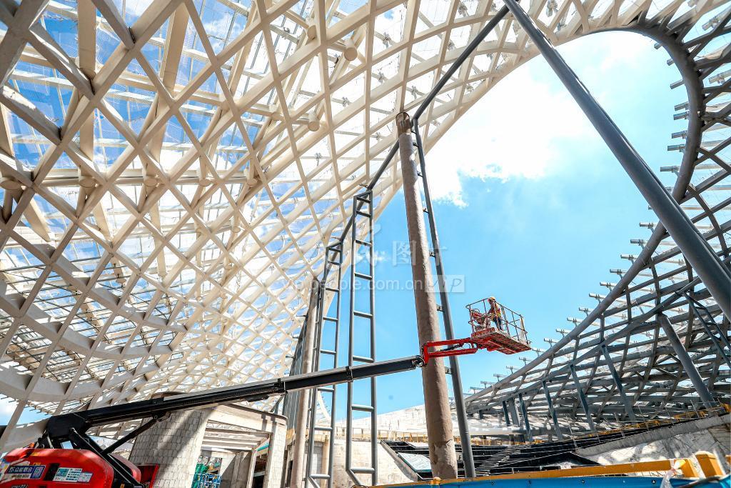 2023年9月19日,在浙江省台州机场改扩建项目航站楼施工现场,工人们正在安装龙骨、幕墙以及墙面喷漆等工作。 目前,台州机场改扩建项目航站楼已进入全面装修阶段,工人们夜以继日锚定建设目标,加紧施工。