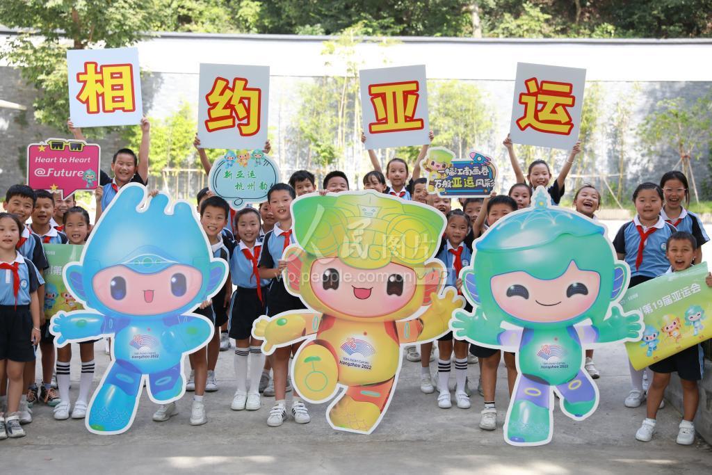 2023年9月19日,在浙江省杭州市临安区天目山镇藻溪小学,学生们为即将开幕的杭州亚运会送去美好祝福。