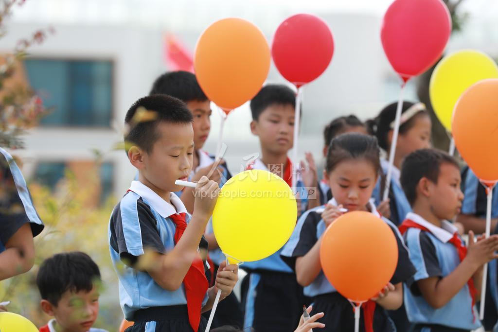 2023年9月19日,在浙江省杭州市临安区天目山镇藻溪小学,学生们在气球上为杭州亚运会写祝福语。