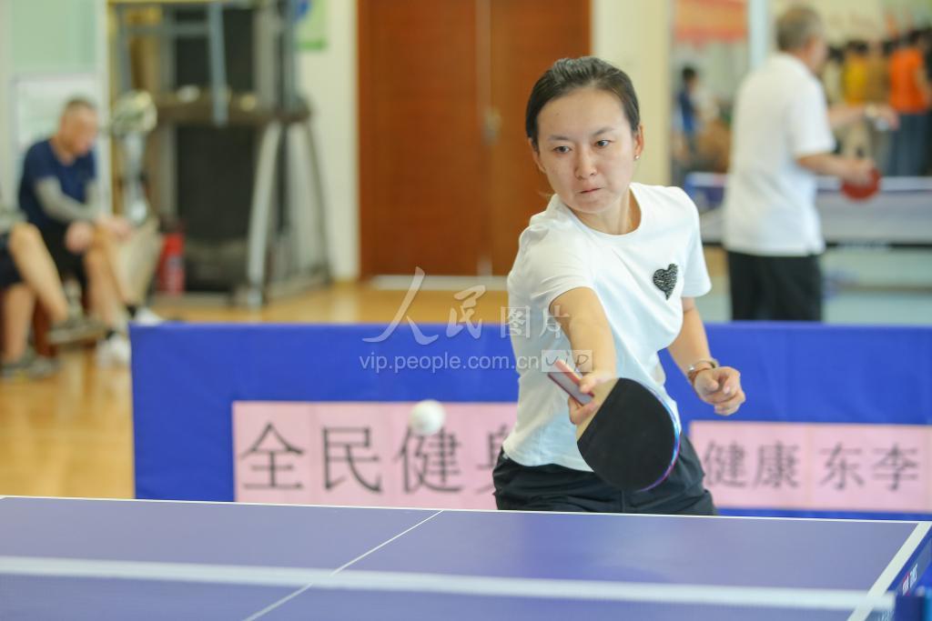 2023年9月19日,在山东省青岛市李沧区浮山路街道东李社区新时代文明实践站,社区居民正在进行乒乓球比赛。
