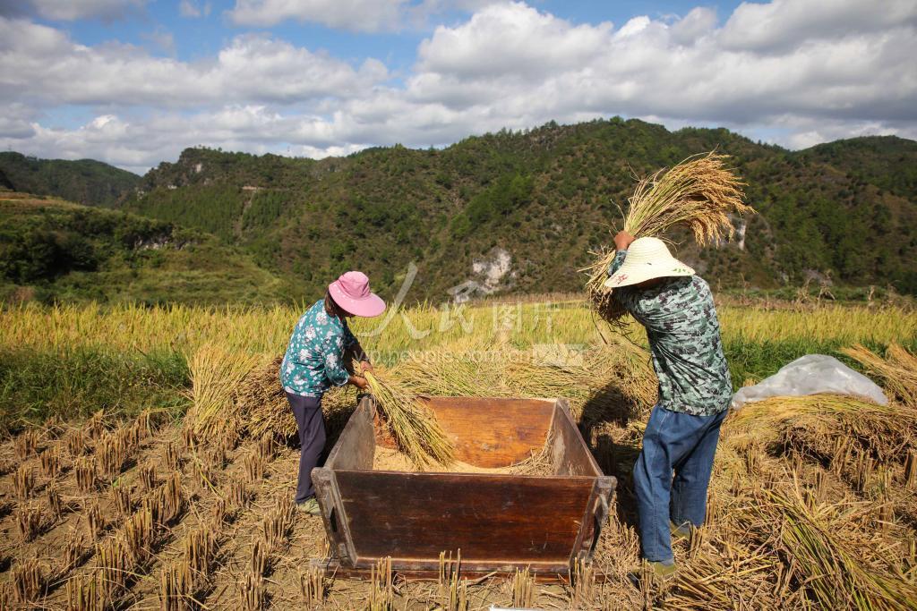 2023年9月19日,村民在贵州省黔东南苗族侗族自治州施秉县杨柳塘镇望江村梯田给稻谷脱粒。
