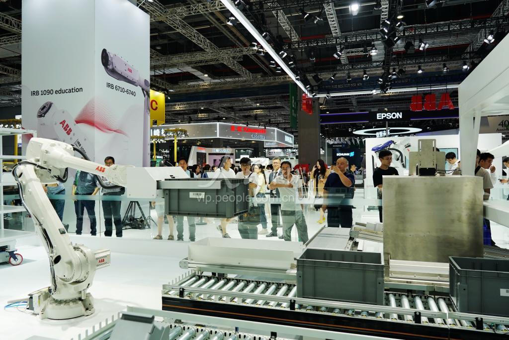 2023年9月19日,2023工博会机器人展区,观众观看ABB公司的视觉引导拣选装箱演示。