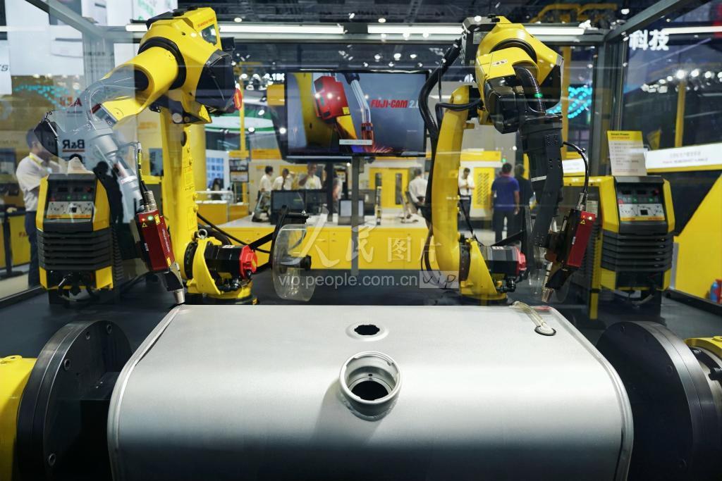 2023年9月19日,2023工博会机器人展区,发那科的双机激光跟踪焊接系统吸引了观众。