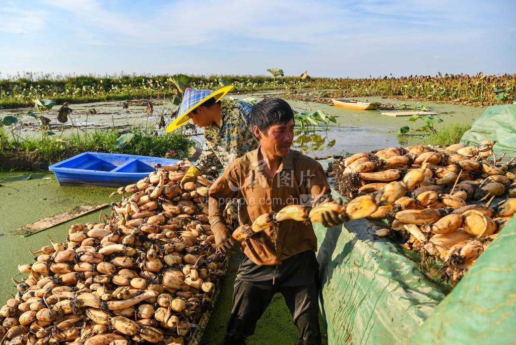 2023年9月19日,江西省丰城市同田乡同田村千亩莲藕种植基地,藕农划着小船将刚采收的莲藕运上岸,准备销往南昌等地市场。 眼下,丰城市同田乡同田村的莲藕迎来丰收,藕农们抢抓晴好天气忙着采收、清洗、分拣、加工莲藕,供应各地市场。近年来,该乡依托当地水资源优势,大力发展莲藕种植,并依托“藕鱼共作”“藕虾共作”等模式,不断提高农业经济效益,促进农民增收,助力乡村振兴。