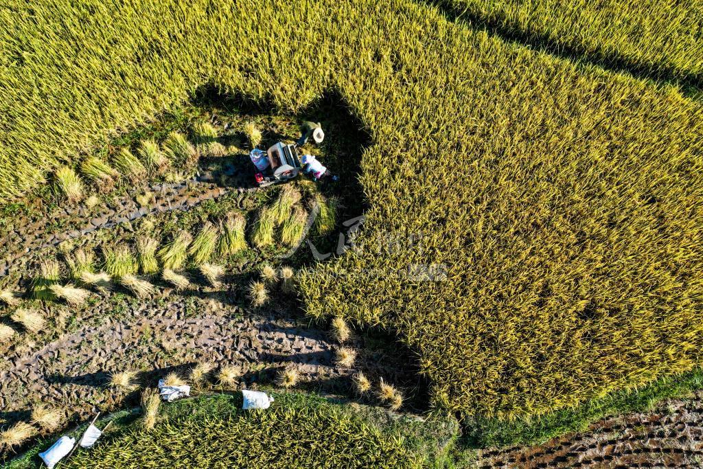 2023年9月19日,贵州省黔西市锦星镇洪湖村,农民在田间收割成熟的稻谷。(无人机拍摄)