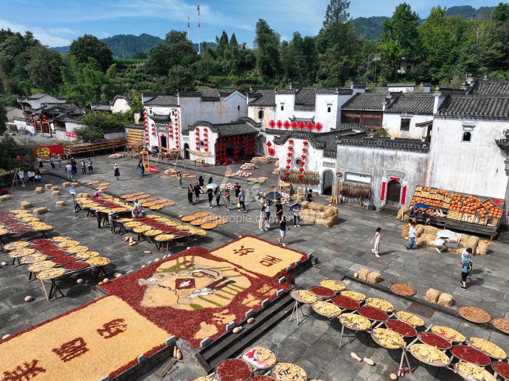2023年9月19日,安徽省黄山市呈坎古村村民将收获的玉米、黄豆、稻谷、南瓜和红辣椒等农作物进行晾晒,在古村晒场上描绘出一幅丰收图景。