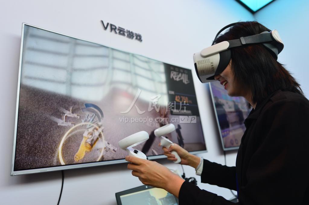 9月22日,在山东省青岛市崂山区举办的2023国际虚拟现实创新大会上,参会者在体验VR云游戏。