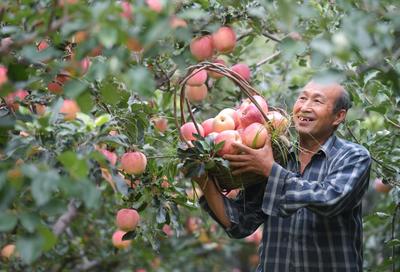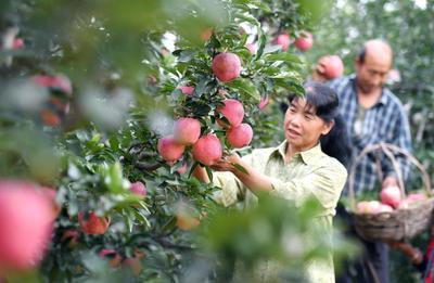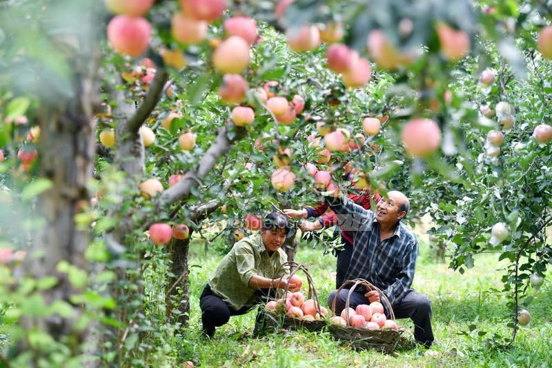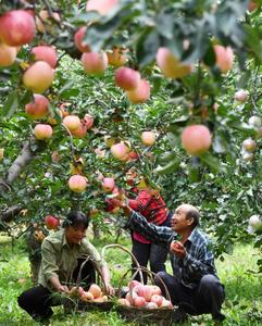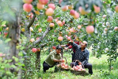2023年9月23日,在河北省石家庄市井陉县东山村的苹果种植基地,种植户忙着采摘苹果,供应市场。