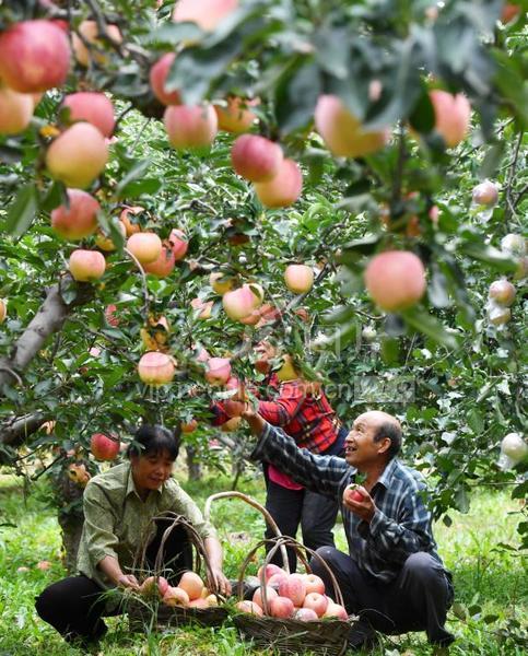 2023年9月23日,在河北省石家庄市井陉县东山村的苹果种植基地,种植户忙着采摘苹果,供应市场。