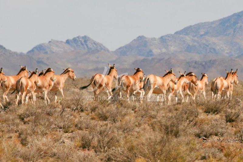 2023年9月23日,一群野驴在新疆哈密市伊州区双井子境内觅食。