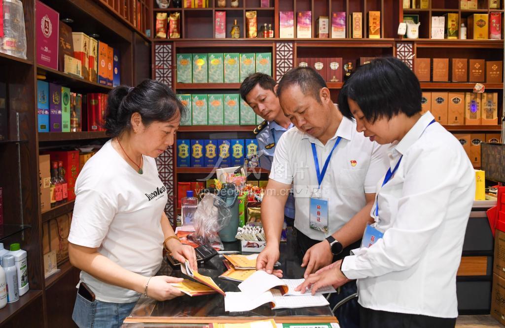 2023年9月25日,江西省樟树市纪检监察干部和市场监管部门工作人员在城区一家烟酒专营店摸排是否存在公款违规购买烟酒等情况。